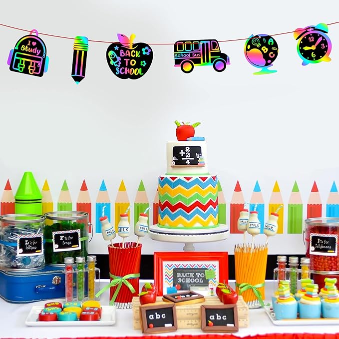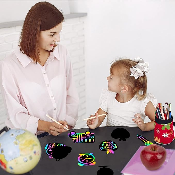- Value Kit: The package contains 60pcs scratch cards (6 styles, 10 of each). There are a lot of school elements, for example bus, bag, pencil, globe and clock. And 20pcs wood stick, 1 bundle of red ribbon. It is a special gift for kids to DIY your own unique back to school scratch card.