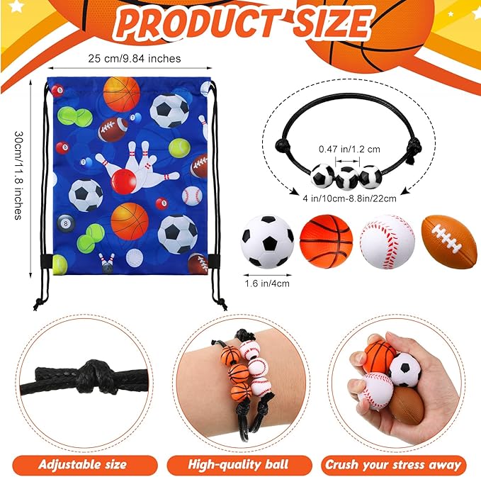 - Suitable Size: the sports bracelet is an adjustable design, the diameter of the ball stress ball is about 1.2 inches, suitable for small hands to play, the ball drawstring bag is about 30 cm/ 11.8 inches in length, 25 cm/ 9.84 inches in width, designed with a drawstring airtight, provide you enough space to store party supplies or daily necessities, such as balls, snacks, books, and so on