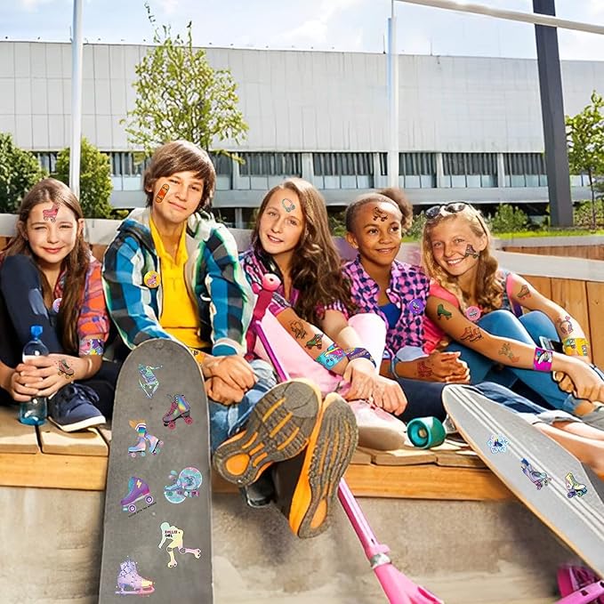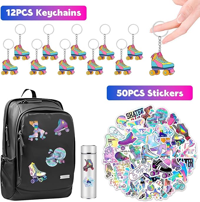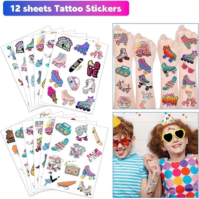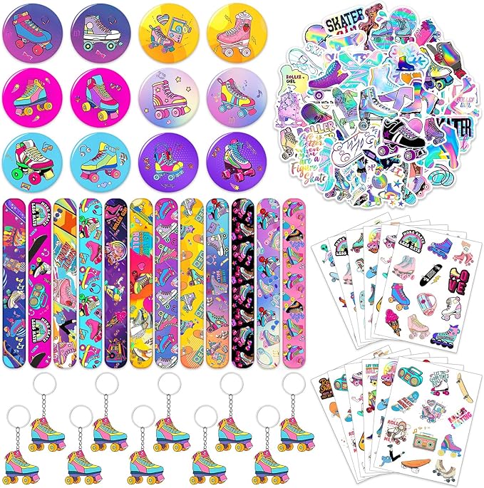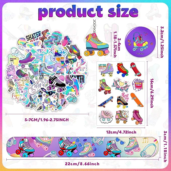 - Package Include: Roller skate party favors includes 12pcs roller skate slap bracelets,50pcs Roller Skate stickers,12pcs Roller Skate paw keychains, 12pcs roller skate badges ,12 sheet of roller skate temporary tattoos (over 144 patterns). Enough quantity to meet your party needs