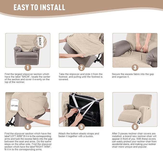 • EASY TO INSTALL: Our recliner sofa slipcovers have exquisite workmanship, including 2 pieces arm covers, 1 piece seat cover, 3 pieces cover totally. The recliner covers also equips with bottom elastic and reinforcement straps, you can use buckle to make the cover in place without moving