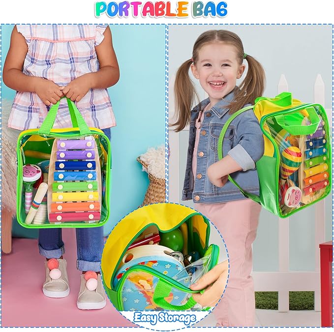 - 【Portable Storage Bag】Comes with a durable, clear, and ample storage bag that you can put all the toddler musical instruments in it. With portable handle and straps, musical toys for toddlers 3-5 can be easily carried or backpacked around.