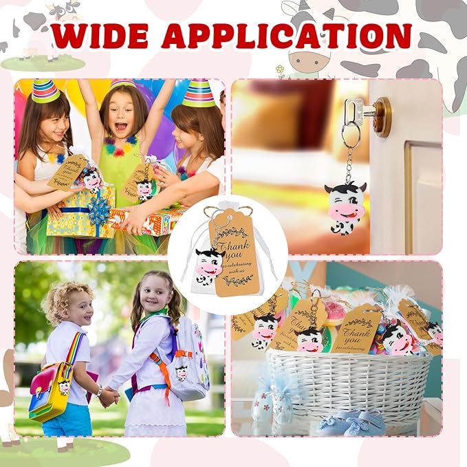 - Nice Combination: cow party decorations include 36 pcs silicone bracelets, 36 pcs cow keychains, 36 pcs organza bags as well as 36 pcs thank you tags with strings, rich, colorful and beautiful set is prepared for your cow themed party supplies