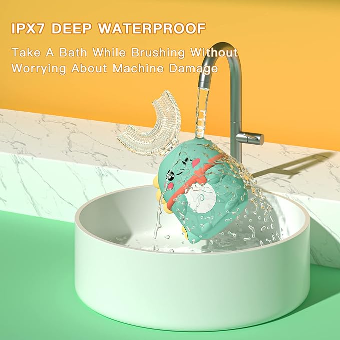 • Two Brush Heads Options: Kids electric toothbrushes provide two brush heads, food-grade silicone u-shaped brush head and soft brush head, U-shaped design is perfect for toddlers and children's teeth, soft silicone, providing a comfortable brushing sensation, thus developing healthy brushing habits, with the soft brush head for more efficient deep cleaning
