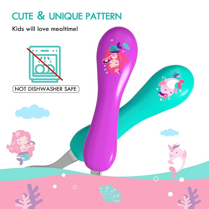 - EXCLUSIVE DESIGN FOR CHILDREN: Ergonomically designed for toddlers to grip in their small hands easily. Rounded forks and spoons without sharp edges won't hurt your little's mouth
