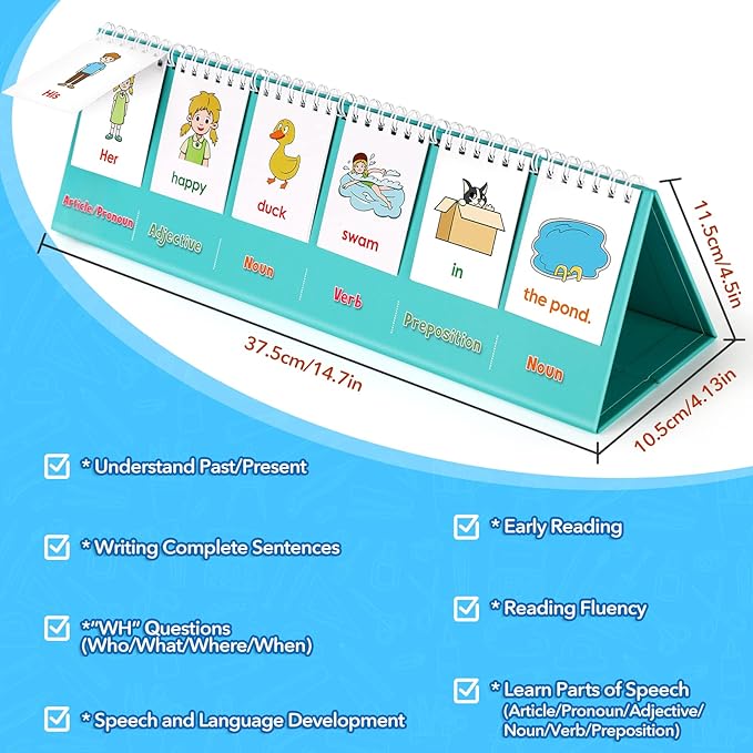 - 【Visual Silly Sentence Building for Beginning or Struggling Readers】Build different fun sentences by flipping over the cards. With vivid pictures placed on large connecting reading cards, sentences come to life! This learning activity reinforces skills for reading fluency, writing complete sentences, “WH” questions (who/what/where/when), speech and language development, learning parts of speech, and understanding past/present. Great for kids who can't read and struggle with sentence writing.