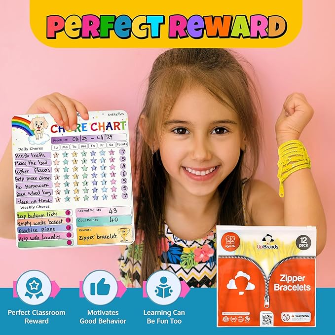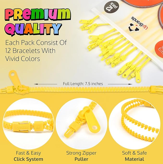- How many fidget toys come in the pack? The pack includes a total of 12 UpBrands yellow zipper bracelets, each measuring 7 inches. These vibrant, single-color bracelets are perfect for sharing, group activities, or ensuring you always have a fun and practical sensory toy on hand. Their bright yellow color and engaging design make them ideal for kids and adults alike, providing a playful and enjoyable sensory experience for everyone.