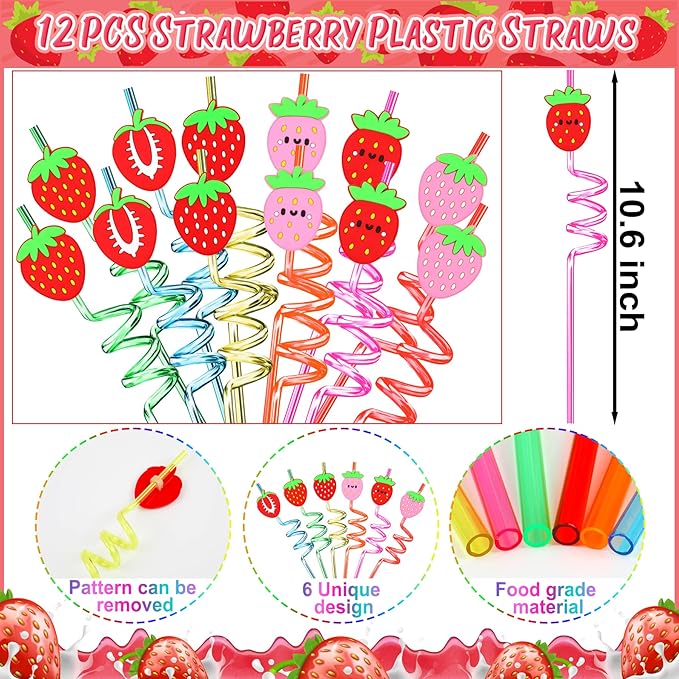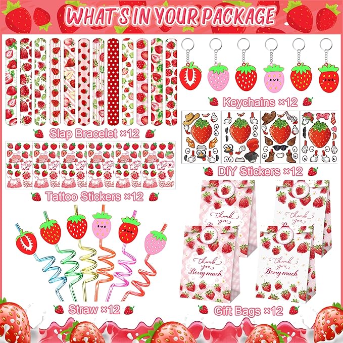 - PACKAGE INCLUDE - Strawberry party favors includes 12 PCS Slap Bracelets(12 styles), 12 PCS DIY Stickers(4 styles), 12 PCS Temporary Tattoos, 12 PCS Keychains(6 styles), 12 PCS Plastic Straws(6 styles) and 12 PCS Gift Bags(2 styles). Enough quantity to meet your party need.