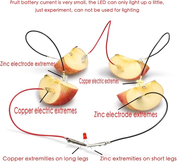 - EASY OPERATION: You only need to prepare fruits, vegetables or drinks to assemble a battery to work with led or electronic watches, such as: apples, oranges, potatoes, lemons, tomatoes, cola, pears, pineapples, or salt solutions, etc