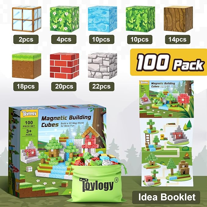 - 【PERFECT SENSORY MONTESSORI TOYS FOR KIDS】Combining the science of UV technology and magnetism which make your building arts more vivid and realistic than those of simple pure colored cubes, 100pcs magnet world set offers a wealth of patterns. More cubes, more possibilities to unleash kid's creativity. Kids will get everything to decorate their little castle or red brick city for their dolls. And they can even build a forest parking lot to park their toy cars.