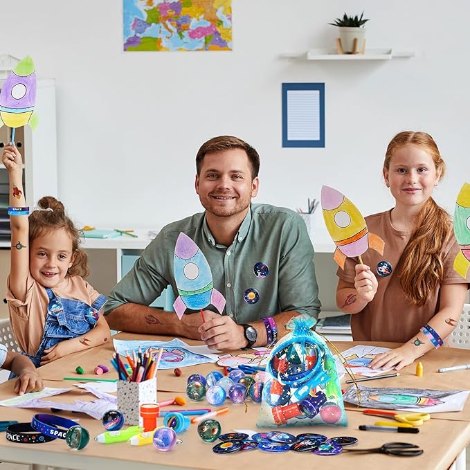 - Outer Space Themed Party Favors: you will get 12 space bouncy balls, 12 space birthday silicone bracelets, 12 space button pins, 12 space birthday tattoos, 12 galaxy rocket light key chains, 12 planet birthday stamps and 12 organza drawstring bags; Let your family enjoy a nice outer space party with their partners