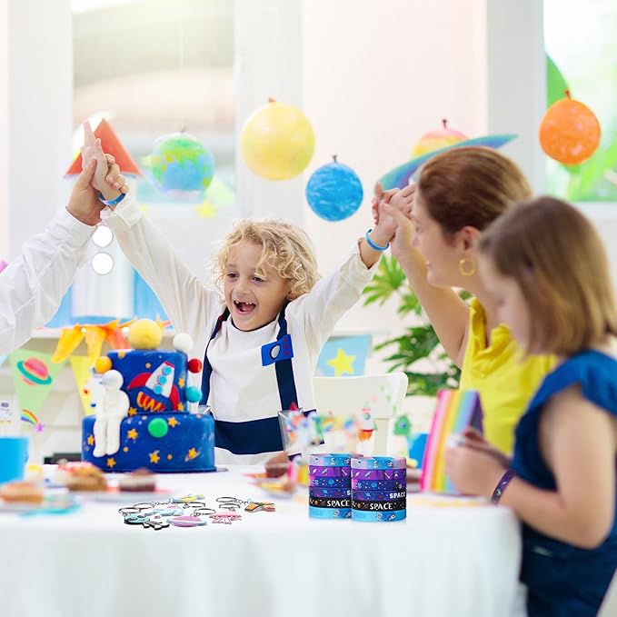 - Outer Space Theme Design: our outer space party supplies feature attractive designs; The space bracelets and keychains designed with elements like planets, astronaut, solar system, alien, rocket, and the bracelets printed an eye catching text [SPACE], which can enhance the party atmosphere