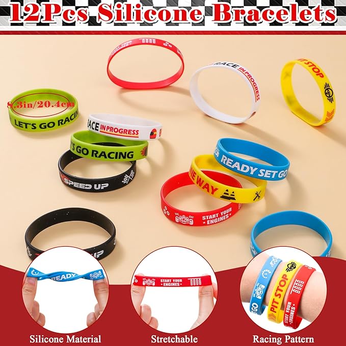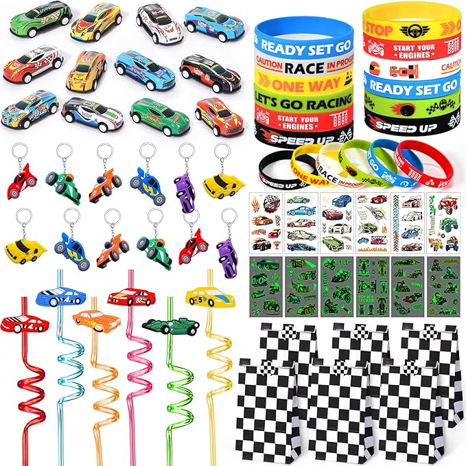 - Race Car Party Favors: We provide cute and fun racing car themed party favors. It includes 12 reusable plastic straws (6 styles), 12 mini pull back cars (random), 12 checkered paper bags (with stickers), 12 keychains (6 styles), 12 silicone bracelets ( 6 styles), 12 luminous tattoo stickers. This is a set of cool racing themed gifts, which can help children better feel the passion of motorsports, and enjoy the feast of racing themed parties