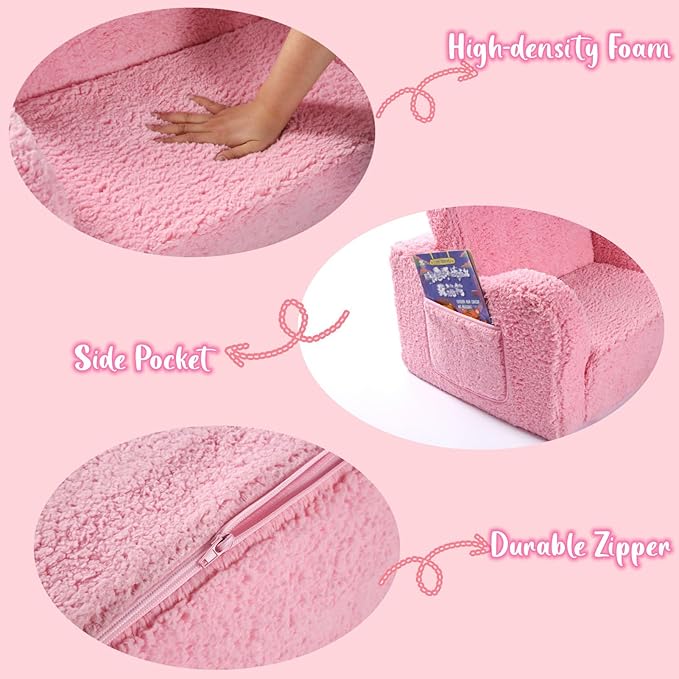 - Kids Sherpa Chair Safety and Reliability: The kids sofa chair is made of durable snuggly-soft polyester Sherpa and is filled with premium foam to support kid's body. The sofa is designed with safety in mind, as there are no sharp corners or hard edges.
