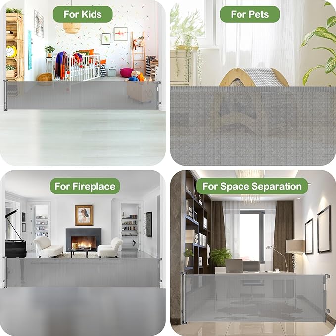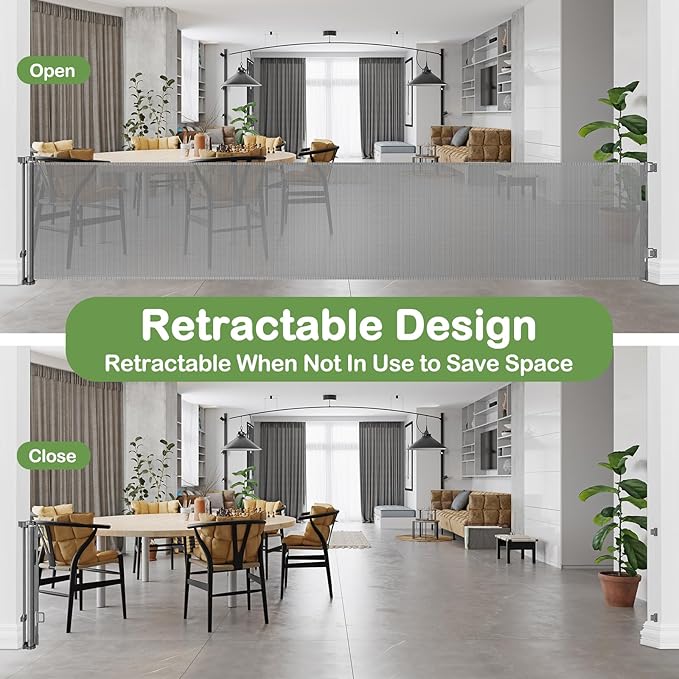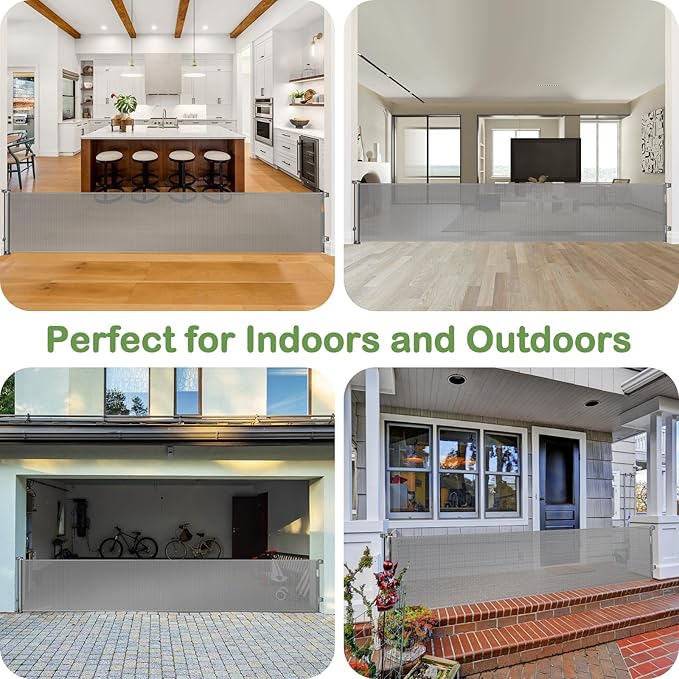 - [Indoor Outdoor Retractable Gate] - Extra large baby gate can be used both indoors and outdoors, such as open kitchens, bottom of stairs, doorways, decks, etc. Create a safe area for babies and pets.