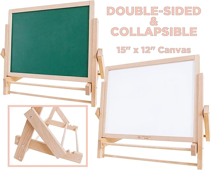 - PROMOTE INDEPENDENCE AND AUTONOMY - Empower your child's learning journey with our Tabletop Easel. Built on Montessori principles, it cultivates autonomy through an intuitive easy-to-use design, collapsible frame for portability, and three preset positions for tailored comfort, enabling your child to steer their own educational journey.