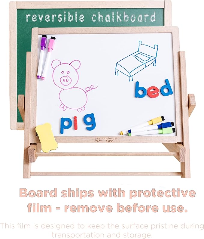 - A LITERACY LAUNCHPAD - Explore literacy, spelling, and language development with the Montessori & Me Tabletop Easel. Featuring a large double-sided whiteboard and chalkboard, magnetic foam letters, and vibrant markers, this easel transforms any space into an engaging and educational haven.