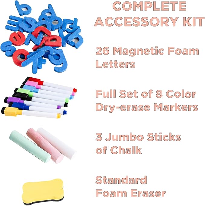 - COMPLETE ACCESSORY KIT - Featuring a full set of 8 color dry-erase markers, 3 jumbo sticks of chalk, an eraser, and magnetic foam letters, our Tabletop Easel is an all-in-one package that includes all the tools your child needs to kickstart their learning and exploration.