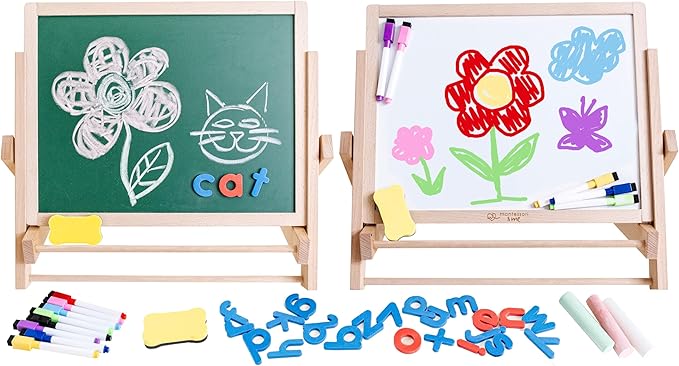 - A LITERACY LAUNCHPAD - Explore literacy, spelling, and language development with the Montessori & Me Tabletop Easel. Featuring a large double-sided whiteboard and chalkboard, magnetic foam letters, and vibrant markers, this easel transforms any space into an engaging and educational haven.