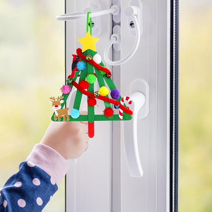 • 27 Individual Christmas Tree Craft Kits: Each of our 27 popsicle stick Christmas tree ornament decorations making kits come individually wrapped, featuring 9 different Christmas tree designs. Included in each kit are assorted popsicle sticks, foam Christmas stickers, pom-poms, chenille stems, jingle bells, adhesive dots, stain ribbon and step-by-step instructions. Package also contains 27 Xmas gift stickers for gifting. These kits will bring holiday joy to kids and adults.