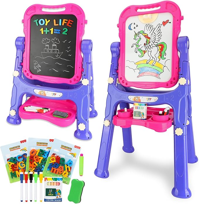 - PERFECT PRESENT, EVERYTHING INCLUDED: This Art Easel for kids 3-5 bears two sides, a chalkboard, and a magnetic dry erase board for kids on the other side. This 4-in-1 chalk board for Kids comes with magnetic numbers and letters, chalk, coloring markers, an eraser for the dry erase board and chalkboard. This makes the perfect holiday or birthday gift for your little one.
