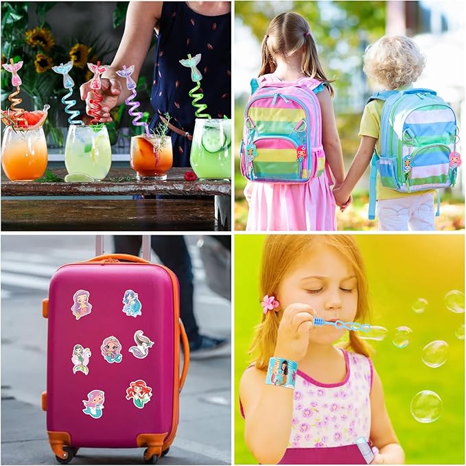 - DELICATE MERMAID DESIGN: Our mermaid party favors contain rich mermaid elements and stylish colors. The 50 mermaid stickers feature the cute mermaid characters. The mermaid straws with cute mermaid design makes sipping your favorite beverage more enjoyable. The mermaid bubbles will be the highlight of the party, adding a touch of fun and creating a magical atmosphere