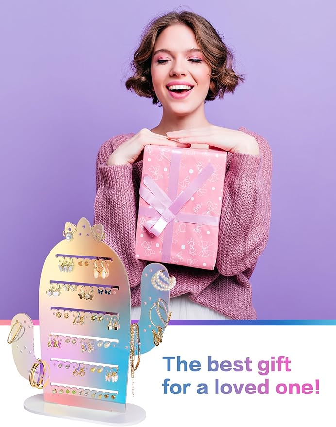 - 🌈【Radiate Playful Colors】Embrace the magical play of light with its cute cactus design combined with mesmerizing rainbow acrylic panels. As the light dances off this earring holder, it reveals an array of captivating colors that's sure to enchant anyone who sets eyes on it.