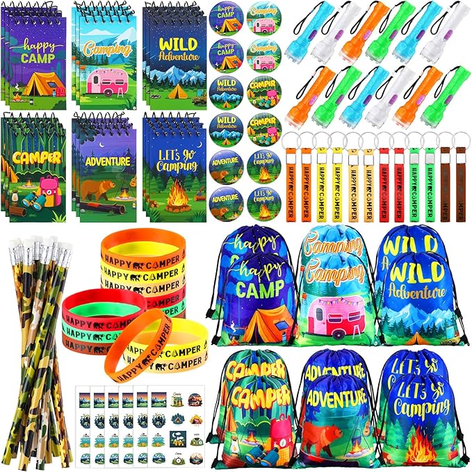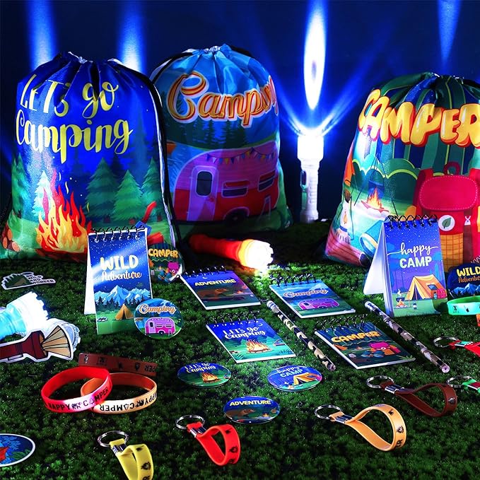 - Camp Adventure Design: each item in this set features a fun and playful camping theme design; From the cute camping theme badges to the mini flashlights with 4 vivid colors, these camping party favors for kids will add a touch of excitement and adventure to your event; Kids and adults alike will love the attention to detail and the unique design of each item; Immerse your guests in the spirit of camping with our specially designed party favors