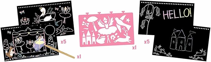- The set comes with a wooden stylus that enables precise scratching on the cards. Additionally, a removable stencil sheet is included, offering various shapes and designs for children to enhance their artwork.