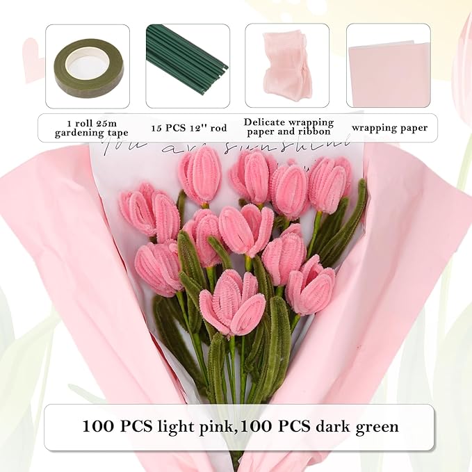 - Pipe Cleaner Flower Kit: You will receive 200 pieces pipe cleaners bulk (100pcs each in pink and green), 15 pieces flower poles, gardening tape, ribbon, beautiful wrapping papers and instruction