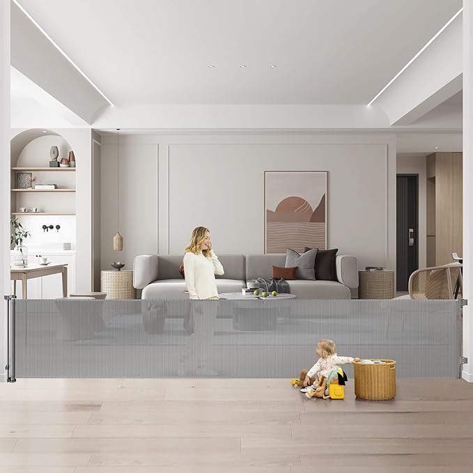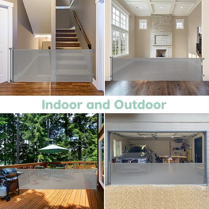 - Multi-use Safety Gate: extra wide retractable pet gate can be used indoors and outdoors, such as in bottom of stairs, doorways, hallways, fireplaces, front doors, porches, garage doors, decks, patios.The extra long baby gates can also separate your living area into play sections.