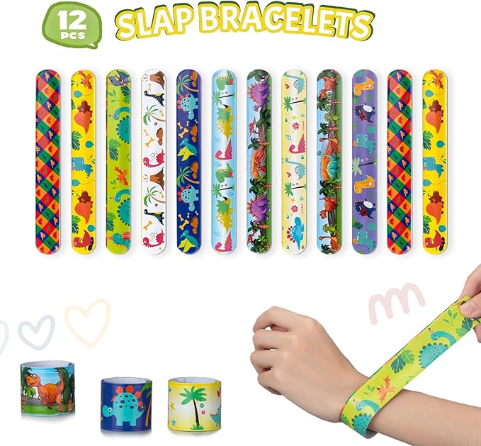 - 🎈GREAT VALUE - Includes 98 pieces of party favors that kids always love: 12 Dinosaur Goodie Bags, 12 Dino Slap Bracelets, 12 Sticky Hands, 12 Party Blowers and 50 Dinosaur Stickers.