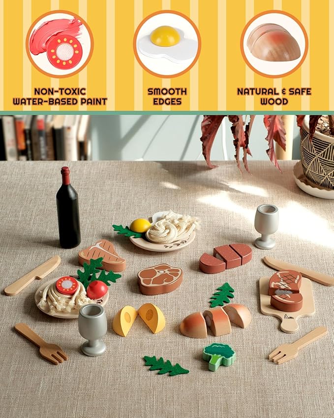Wooden Play Food Set, Wooden Food Toys for Toddlers 1-3, Wooden Kitchen Toys Include Steak Pasta Wine Shopping Bag, Montessori Kitchen Tools for Toddlers, Cut Fruit Gift for Girl Boy 3-5 Years