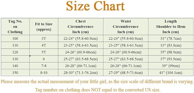- Children size for toddler and little girls, age 3T, 4T, 5T, 6, 7-8 and 8-10. Please measure your child's current clothing and refer to the size chart to choose a proper size for best fit.