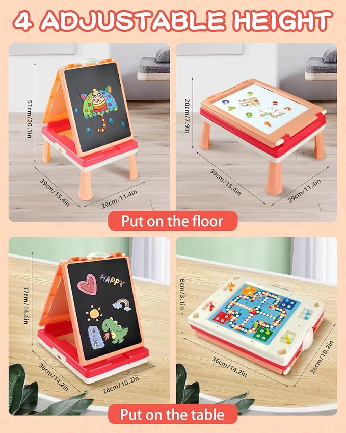 - 4-IN-1 DOUBLE-SIDED ART EASEL: Explore endless possibilities with the multifunctional easel board.Dual-sided blackboard and whiteboard allows two kids to stay engaged simultaneously. The magnetic feature on the whiteboard enables card-based learning, while tabletop games add an extra layer of fun exploration