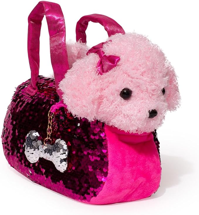 - Complete Playset: 3pc playset includes cute puppy stuffed animal with bow & collar, sparkling carrier purse bag with reversible sequins, & dogbone charm.