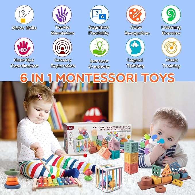 - 6 in 1 Montessori Toys Set : Provide your baby with the wonderful start in life through our specially designed baby toy set. This comprehensive set features building blocks, stacking rings, pull-string toys, wooden sorting toys, hand-tapping xylophone, and cube toddler toys. Encouraging color and shape recognition, sorting skills, fine motor , hand-eye coordination, spatial awareness, cognitive flexibility, and logical thinking. Nurture your baby's exploration with our thoughtfully crafted toys