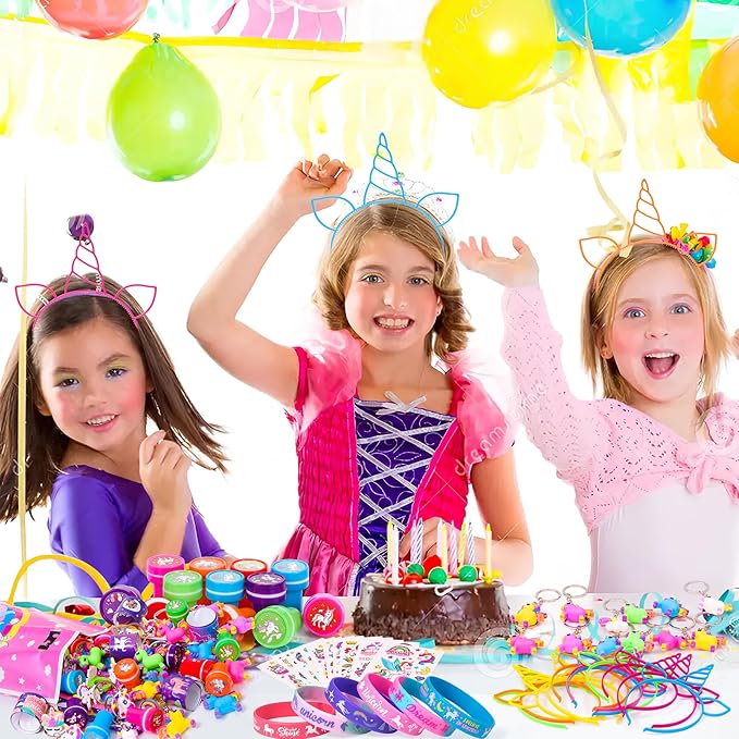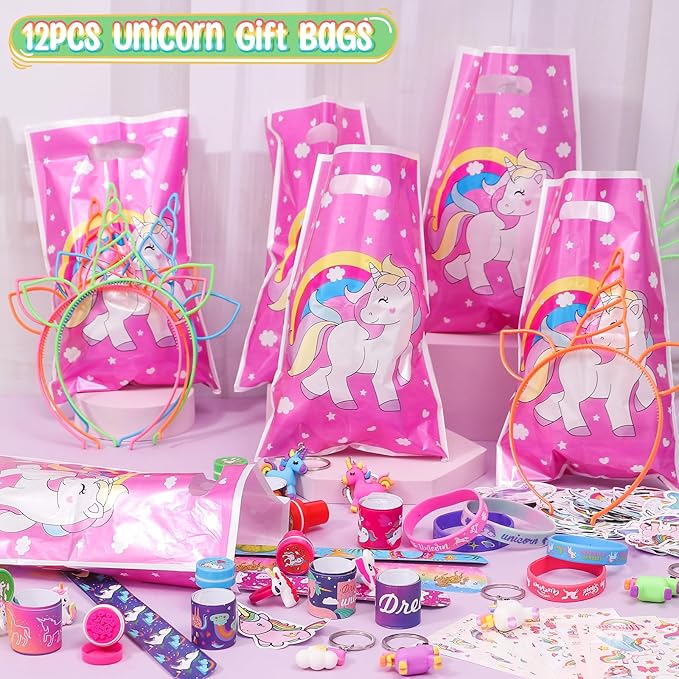 - UNICORN PARTY FAVORS: Our unicorn birthday party favors set includes 12 silicone bracelets (6 styles), 12 headbands (6 colors), 12 stampers (6 styles), 12 slap bracelets, 12 unicorn keychains (8 styles), 12 rings (12 styles), 12 tattoos stickers (10 styles), 50 unicorn stickers, 12 gift bags. This works for a party of 12 girls kids, all the girls are sure to be attracted by our unicorn party supplies