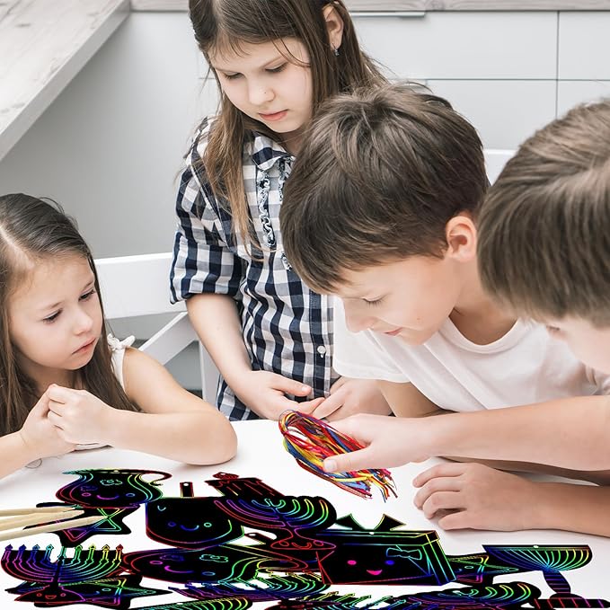 - Chanukah DIY Scratch Cards Set: you will receive 64 pieces of Hanukkah decorations, 30 pieces of wooden styluses and 64 ribbons, sufficient quantity and exquisite combination, which can meet your daily gaming needs and party decoration needs