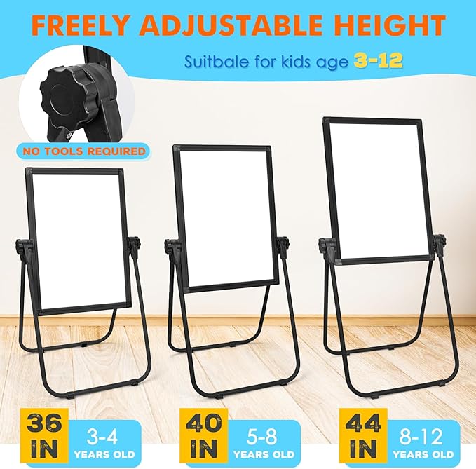 - Adjustable Height: Our art easel for kids easel can freely adjust its height from 22" to 44", growing with kids ages 2-4 4-8 9-12. The toddler easel for kids is ideal for children's word spelling, number counting, artistic drawing, math games