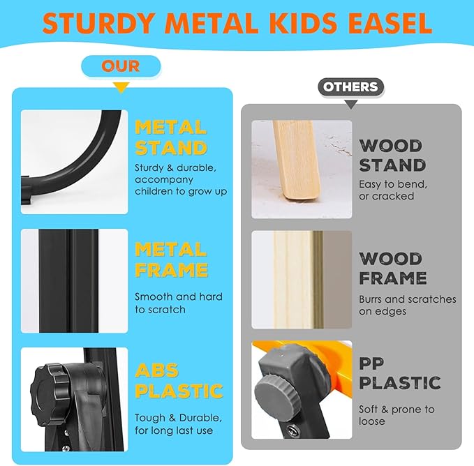 • Sturdy & Safe: The art easel for toddlers is made of premium metal and strong plastic, is longer-lasting than wood easels, and can withstand years of play. All surfaces and edges are smooth and have no burrs like wood ones, safe for long-time use