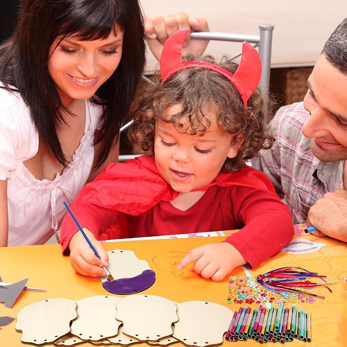 - DIY Halloween craft for Kids:Paint your favorite color on the unfinished wooden skull ,and then go through the holes of wood chips and chime rods with a rope,and you will get a unique wind chime.These wooden chimes craft kit will sway with the wind and made a joyful sound. Hanging wind chimes in the windows, doors and walls which emit more energy,a easy way to adding a terror Halloween atmospher .