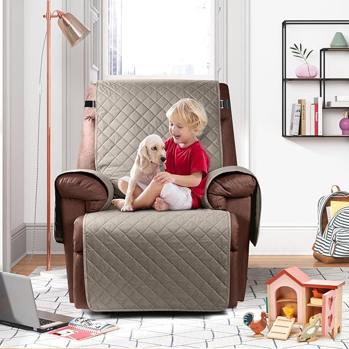 KinCam 100% Waterproof Recliner Chair Cover, Reclining Couch Covers for Pets, Dogs, Recliner Couch Slipcover Furniture Protector with Elastic Straps for Kids(28", Khaki)