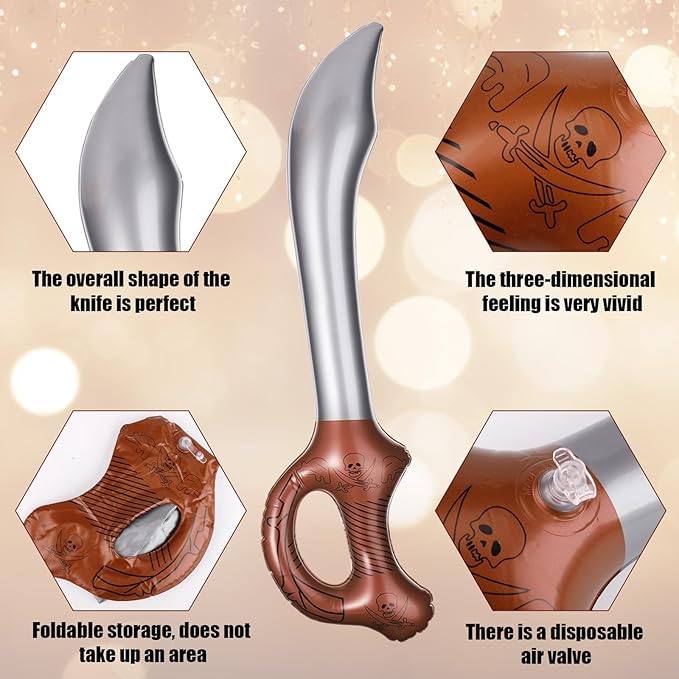 - Pirate Inflatable Toy Knife: Made of good quality PVC and plastic, long-lasting and reusable, lightweight, easy to carry. It can be folded when not in use. After being inflated, it measures about 22.8 inch / 58cm long and 4.5inch / 11.5cm wide, which is suitable for most people.