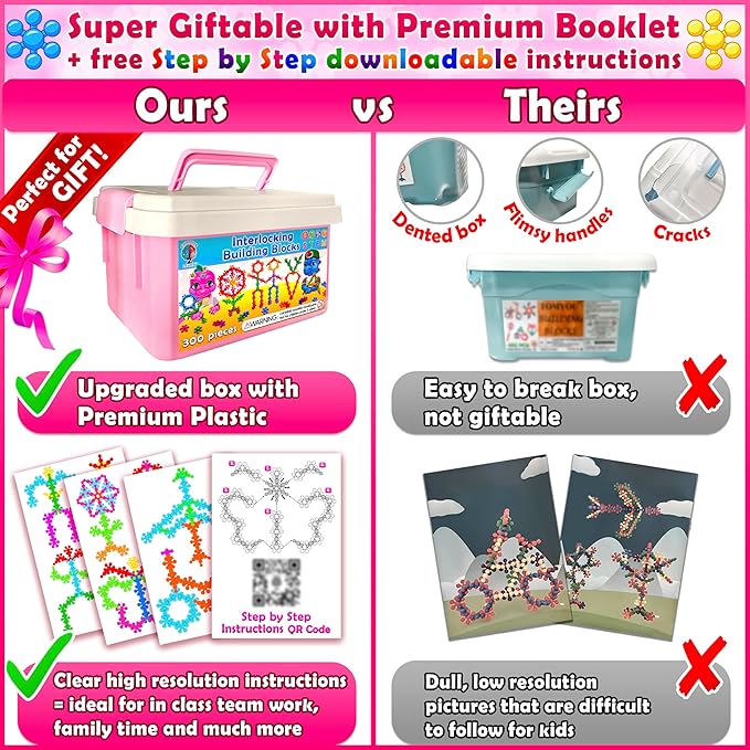 - ★ Excellent Value: Includes 300 pieces of colorful building blocks, it can be easy to combine into any shape. Such as flowers, animals, cars, buildings, worlds and more.