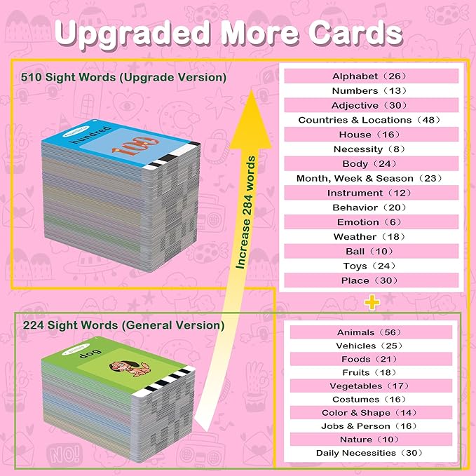 - ✅ [510 Sight Words] - Rich cards content, Talking Flash Cards contains 510 sight words, covering 24 subjects, including animals, vehicles, character, food and more. Expose toddler to many unknown objects, full of imagination.