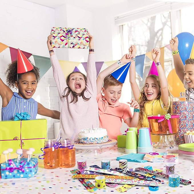 - 【Easy to Wear】 Enjoy the fun of popping from a straight strip to a wrist-hugging snap bracelets kids in an instant. Simply slap kids bracelets on your wrist & they will form a comfortable circle based on the size of your wrist. The bulk party favors for kids little girl bracelets will not break or scratch your skin and it is lightweight and comfortable, allowing you to wear cute slap bracelets for boys for an extended period of time. Kids age 3 and up are recommended.