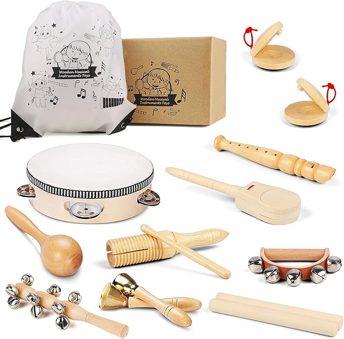 Chriffer Kids Musical Instruments Toys, Percussion Instruments Set with Storage Bag, Preschool Educational Music Toys for Boys Girls, Natural Eco-Friendly Wooden Music Set (10pcs)