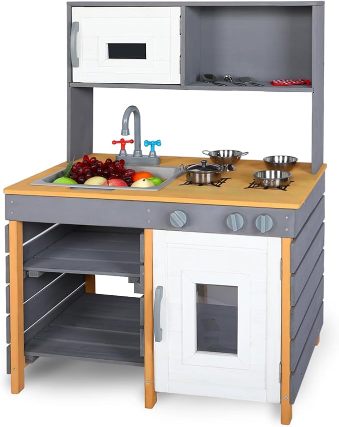 - [PLENTY OF STORAGE]:There is a large storage area for children to collect their handmade mud food and other toys. Our mud kitchen also has two storage shelves under the sink. Total Product Dimensions: 38.5"(L) x 28.5"(W) x 18"(H)