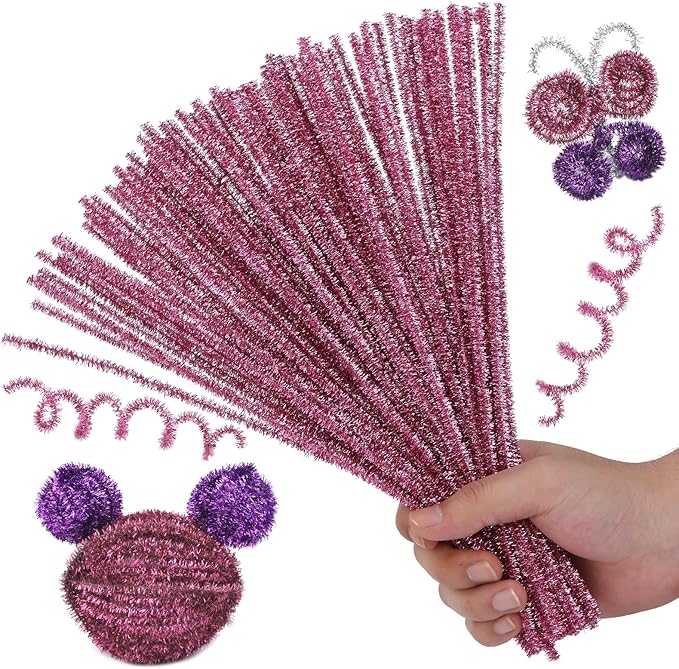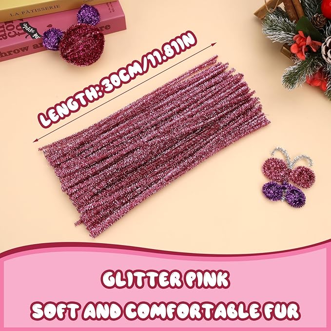 Hssugi Pipe Cleaners, 100PCS Christmas Pipe Cleaners Craft Supplies, Glitter Pink Pipe Cleaners Bulk Fuzzy Sticks for DIY Art and Craft Projects Home Decoration