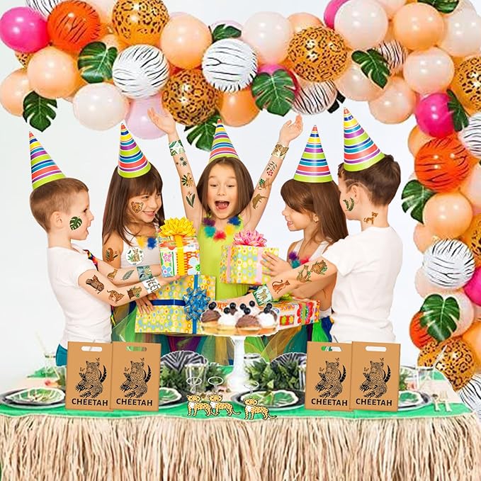 - PACKAGE INCLUDE: Cheetah party favors includes 12pcs cheetah slap bracelets, 12pcs cheetah key chains, 12pcs cheetah badges, 12pcs cheetah gift bags,12 sheet cheetah temporary tattoos (72 Patterns). Enough quantity to meet your cheetah party needs